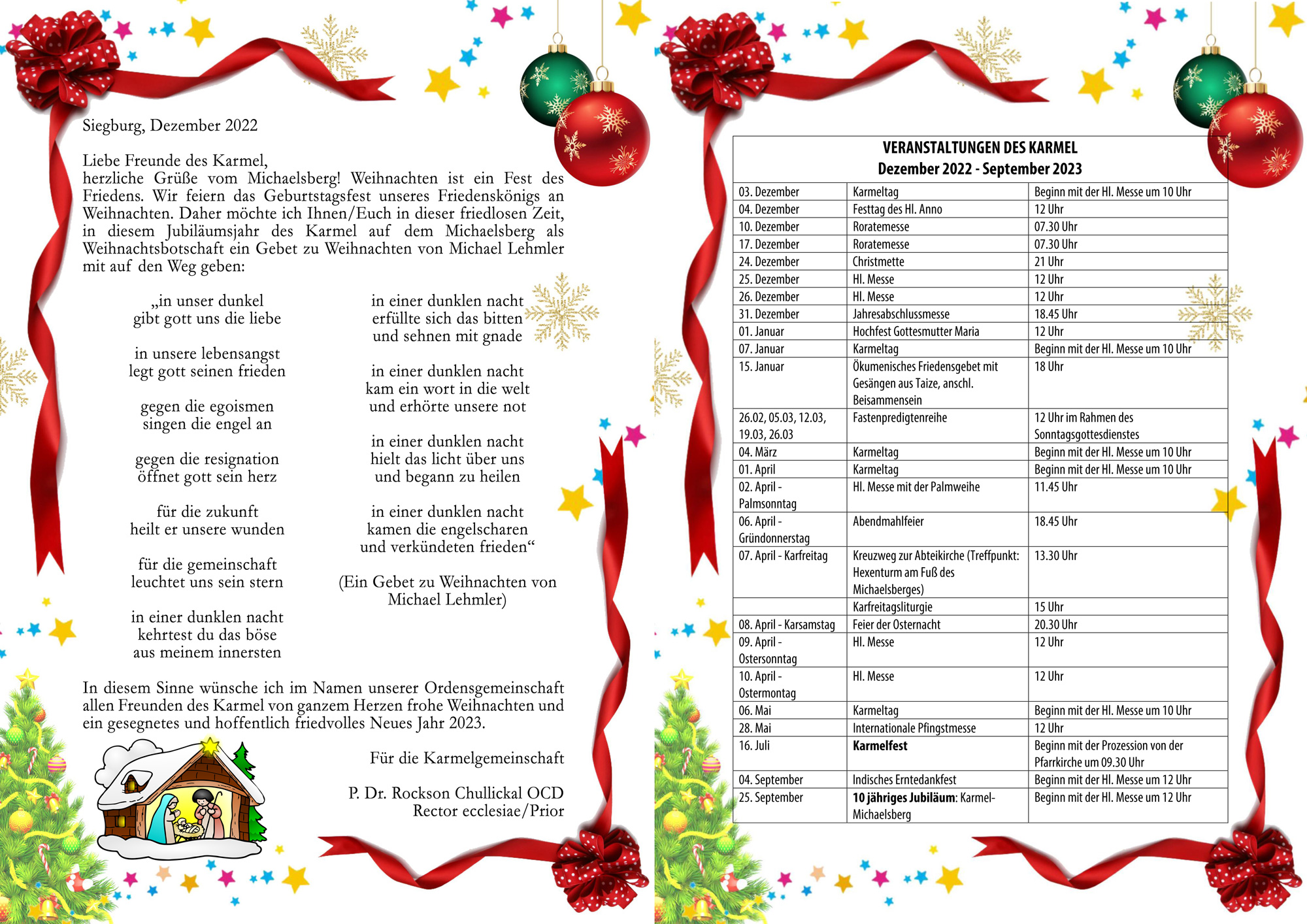 Weitere Termine sind das Taizé-Gebet am 30. Oktober um 18 Uhr, die heilige Messe für die verstorbenen Benediktiner an Allerheiligen, 1. November, um 12 Uhr oder die Karmeltage am 5. November, 3. Dezember, 7. Januar, 4. April, 4. März und dem ersten April.