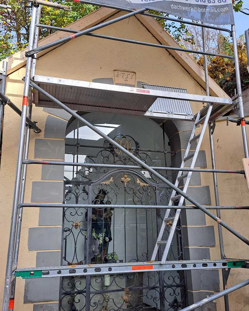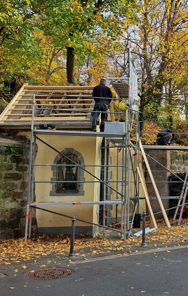 Jetzt bekam die Muttergottes erst einmal wieder ein dichtes Dach über dem Kopf. Ob die Putzsanierung und der Anstrich noch dieses Jahr erfolgen können, entscheidet Petrus! Die zu verarbeitenden Mineralfarben und der Putz brauchen, um abzubinden, durchgängig Temperaturen über 10° - und das wird zumindest nachts nicht mehr erreicht. Aber so oder so – es wird weitergehen!