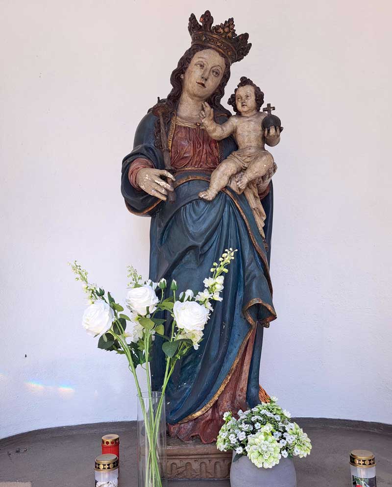 Wenn wir heute in die Kapelle hineinspähen, sehen wir eine nachdenkliche Muttergottes. Sie sehnt sich auch nach einer farblichen Restaurierung. Vielleicht finden sich ja noch weitere SPONSOREN, die hier das Portemonnaie öffnen? Einfach melden! Beim Förderverein, bei der der Stiftung, der Kreisstadt Siegburg nachfragen. Alternativ leitet das Pfarrbüro Stankt Servatius Ihre Anfrage auch gerne weiter!